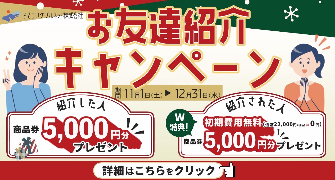 - お知らせ 2025冬期限定!ケーブルテレビお友達紹介キャンペーンを実施します!!
