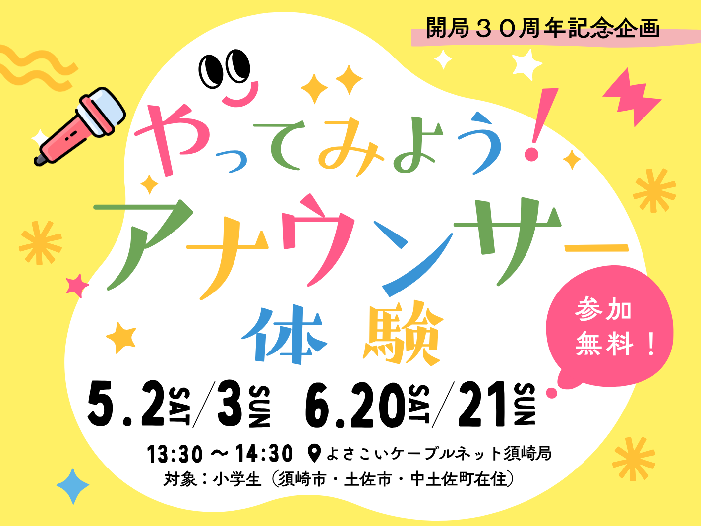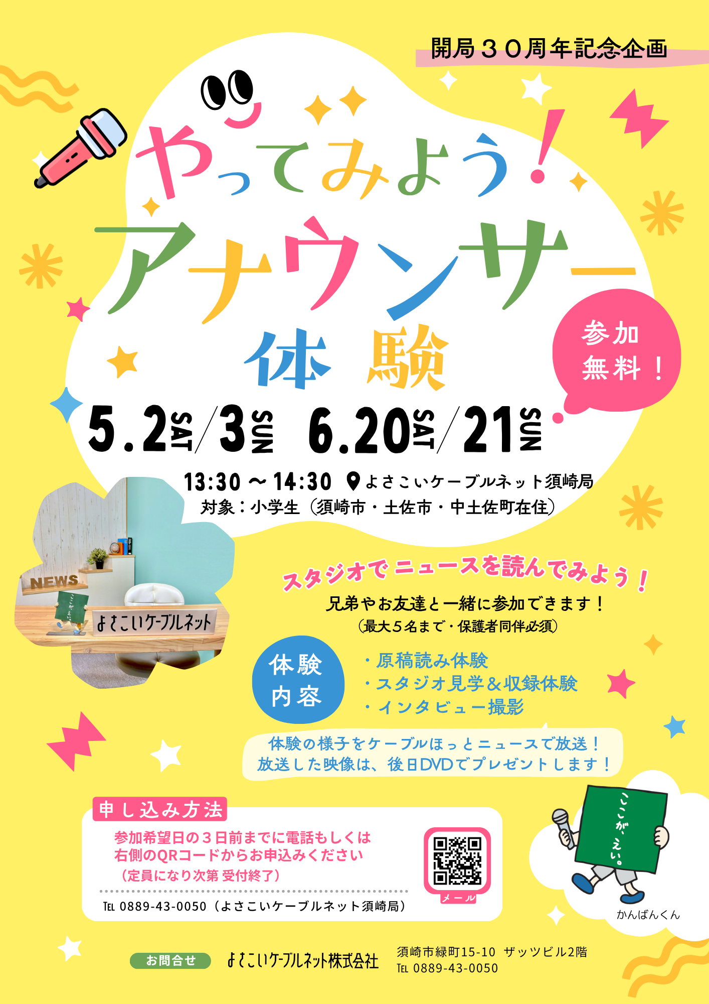 須崎市・土佐市・中土佐町の小学生を対象にした「アナウンサー体験」の参加者を募集します。